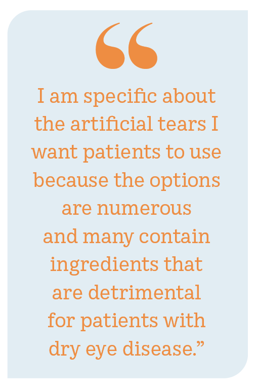 I am specific about the artificial tears I want patients to use because the options are numerous and many contain ingredients that are detrimental for patients with DED. My first choice is iVIZIA (Thea), a tear that offers extended relief for any type of DED and is preservative free, so it is safe for frequent use without causing ocular surface toxicity.